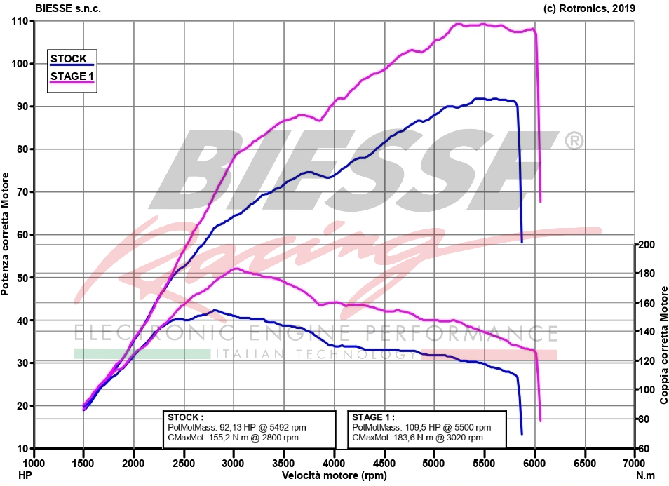 | Note: • All Biesse Racing softwares and files keep unchanged the vehicles’ anti-pollution standards. ¹ Il dati di potenza e coppia dichiarati sono un’indicazione basata sui risultati ottenuti sul nostro banco prova in fase di sviluppo, ovvero con auto in condizioni meccaniche perfette, carburante premium e temperature dell’aria ottimali. I valori possono subire variazioni di +/- 5% sulla potenza complessiva in base alle condizioni di prova sull’auto del cliente (temperatura aria, qualità carburante utilizzato, stato meccanico della vettura). I nostri software vengono prodotti singolarmente sulla base delle richieste del cliente ed anche questo può influire sul valori di incremento effettivi. ² L’opzione test su banco prova comprende una serie di acquisizioni su uno dei nostri banchi a rulli. Le prove vengono effettuate prima e dopo l’intervento di modifica software gestione motore, in modo da poter comparare i risultati ottenuti con i valori originali. I test vengono sempre svolti con almeno 5 lanci sia con auto originale che successivamente alla modifica o fino a quando necessario per determinare correttamente la potenza. Anche un eventuale aggiustamento della calibrazione prevede una nuova sessione di test senza maggiorazioni sul prezzo concordato. Eventuali lanci su banco oltre i 5 previsti non comportano costi aggiuntivi e possono essere eseguiti a discrezione dei tecnici. In caso di installazione di stage avanzati è possibile richiedere che i test vengano svolti anche in fase intermedia per valutare il miglioramento legato ad upgrades meccanici, questa opzione comporta un aumento del preventivo da concordare in fase di prenotazione. | |||||||||||||||