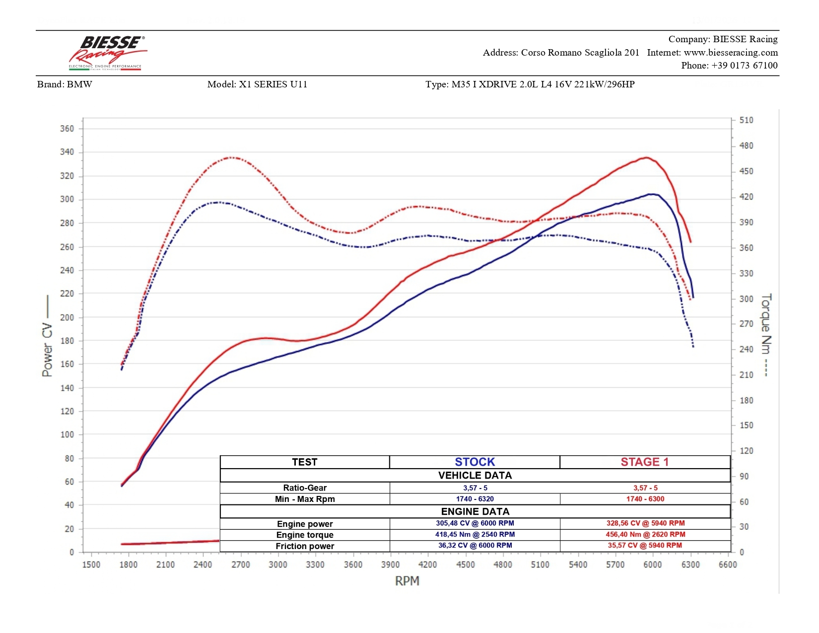 ² L’opzione test su banco prova comprende una serie di acquisizioni su uno dei nostri banchi a rulli. Le prove vengono effettuate prima e dopo l’intervento di modifica software gestione motore, in modo da poter comparare i risultati ottenuti con i valori originali. I test vengono sempre svolti con almeno 5 lanci sia con auto originale che successivamente alla modifica o fino a quando necessario per determinare correttamente la potenza. Anche un eventuale aggiustamento della calibrazione prevede una nuova sessione di test senza maggiorazioni sul prezzo concordato. Eventuali lanci su banco oltre i 5 previsti non comportano costi aggiuntivi e possono essere eseguiti a discrezione dei tecnici. In caso di installazione di stage avanzati è possibile richiedere che i test vengano svolti anche in fase intermedia per valutare il miglioramento legato ad upgrades meccanici, questa opzione comporta un aumento del preventivo da concordare in fase di prenotazione.